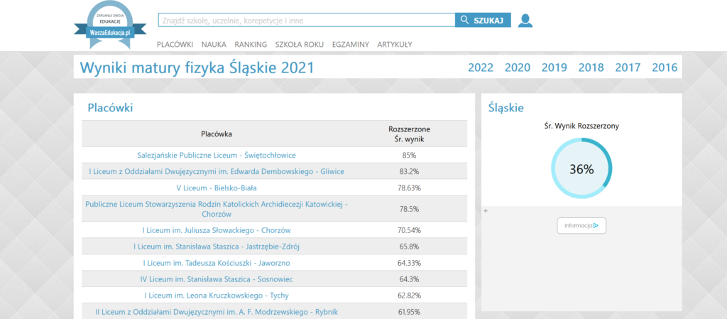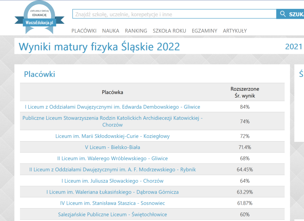 SZKOŁA PONADPODSTAWOWA: Rok 2021 – wynik z fizyki rozszerzonej najlepszy wśród wszystkich szkól średnich województwa śląskiego: